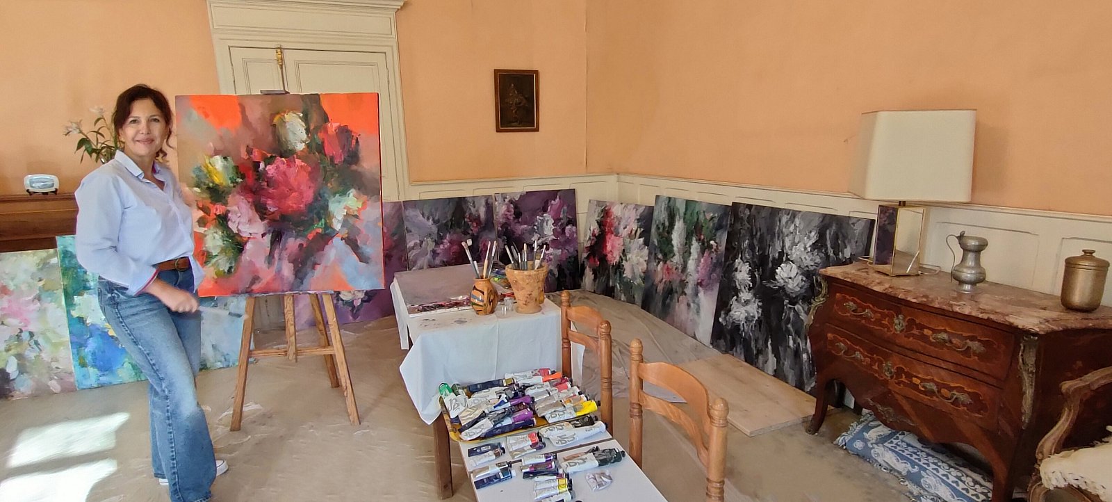 Welcome to the captivating world of Iryna Malynovska, an abstract painter who has found her creative epicenter in an almost mythical 1st-century mansion. Nestled within a sprawling park, the mansion imposes its grandeur and historical aura at first glance, like a castle suspended in time. This sumptuous setting is far from merely a residence; it serves as a constant source of inspiration for Iryna.